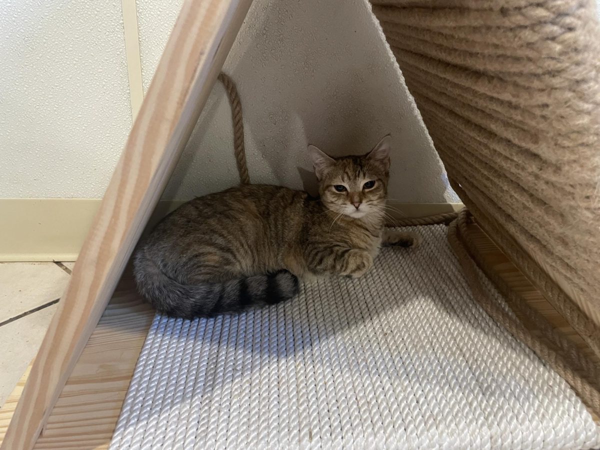 Common Sense for Animals’ shelter cat, Vonnie, wakes up from a nap on a nearby chair. Vonnie, along with a variety of other animals, are in need of rescuing by loving families.